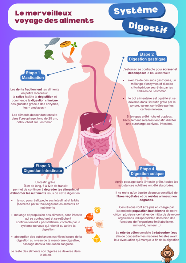 Entre deux, les aliments ingérés auront fait la rencontre, dans l’ordre et durant plus ou moins vingt-quatre heures, de :